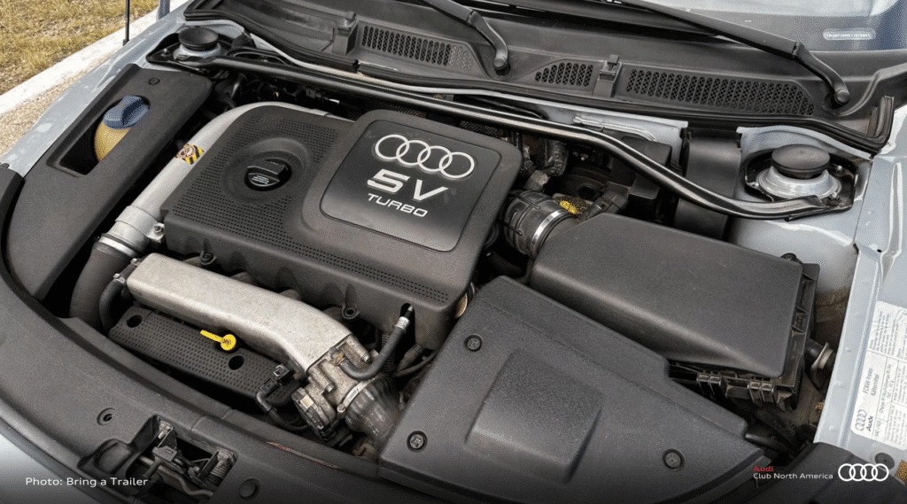 Let’s start with the good news. This car is painted in one of the best colors ever offered on the TT. It accentuates the stunning lines of the car wonderfully. The car is equipped with a 6-speed manual transmission and Quattro all-wheel drive. It is powered by the turbocharged 1.8-liter EA113 inline-four-cylinder engine which was factory rated at 225 horsepower. That was the most powerful TT of the day and can zip you to 60 mph in about 6 seconds.