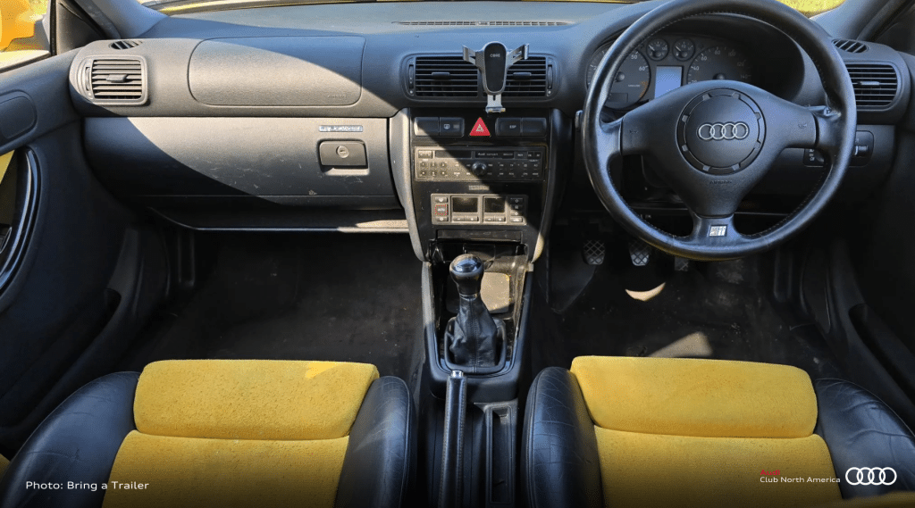 This little buzz bomb is equipped with a six-speed manual transmission and a quattro all-wheel-drive system along with 17-inch Avus alloy wheels, xenon headlights, power-adjustable Recaro front seats, automatic climate control, and an Audi Concert cassette stereo. But the star of the show just might be the black leather and yellow Alcantara interior.