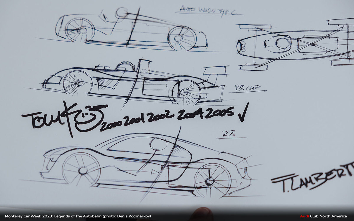 Auto Union Typ C, Audi R8 LMP1, Audi R8, Audi R8 LMS Evo Nürburgring…legends of the circuit and road. Tom Kristensen and Frank Lamberty are also legends in their own right; Tom is a nine-time winner of the 24 Hours of Le Mans and Frank’s influence has touched too many Audi models to count, but he’s the guy largely attributed with the first-generation R8 that reset the bar in the sportscar world, then did it in the racing world by also designing the R8 LMP1.