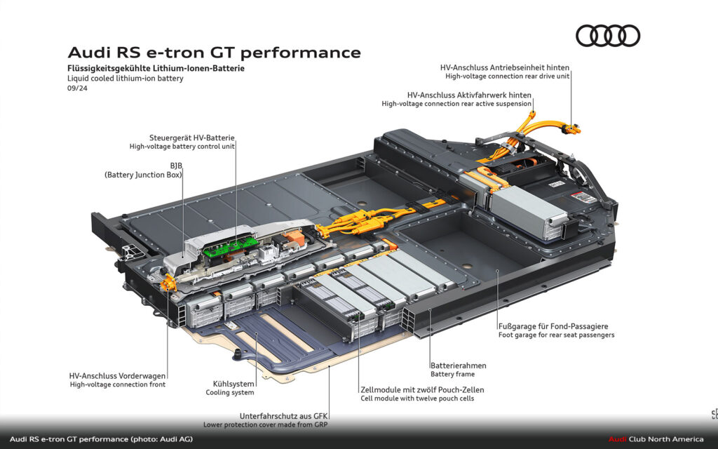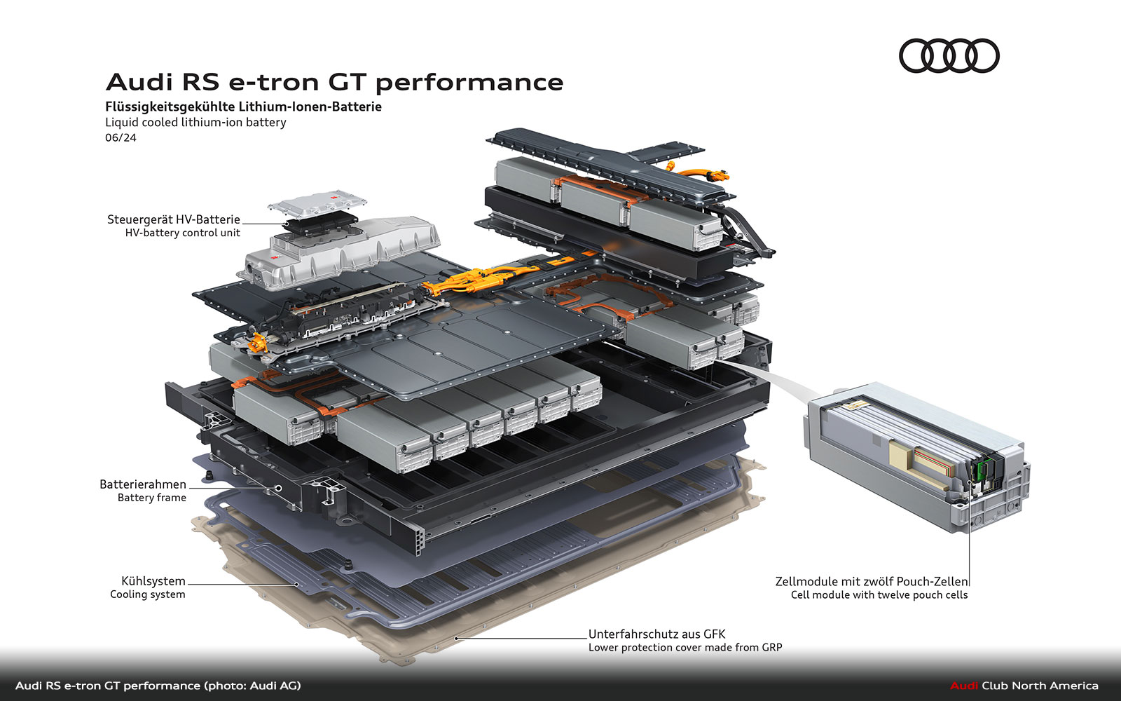 The new cell chemistry is also partly responsible for the increased output of the RS e-tron GT performance2, with an adjusted mixing ratio of nickel, cobalt, and manganese and a gross storage capacity of 105 kWh (97 kWh net). This results in higher energy capacity and higher charging and driving currents compared to the predecessor model. The maximum charging currents have been increased to 400 amps. When Launch Control is activated, up to 1,100 amps of current can flow.