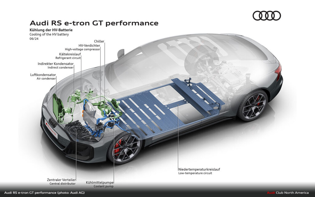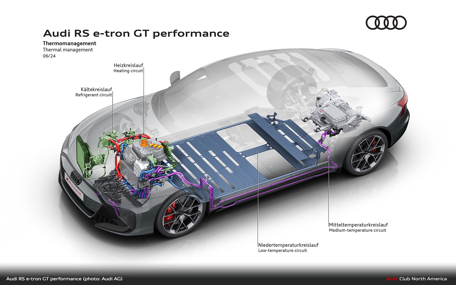 One of the development goals for the performance model was high efficiency across all load ranges and repeat output availability. This makes for more reproducibility and superior performance. Adapted thermal management and intelligent interconnection of the four coolant circuits play a vital role – especially in RS performance mode, which is an exclusive feature of the top model. When increased output is used, the thermal management system switches on the AC circuit to ensure the HV battery is sufficiently cooled. The adapted cooling circuit conditions the interior while simultaneously and actively lowering the temperature in the coolant circuits of the HV battery and the two electric motors in the RS e-tron GT performance2. Cooling of the electric motors, interior air conditioning, and conditioning of the HV battery can now be controlled largely independently of each other. Audi made significant changes to pumps and valves to optimize the performance of the thermal management system.