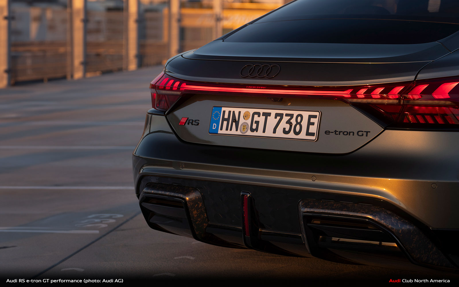 In the RS e-tron GT performance2, the customer can control the vehicle sound – from the quiet of an electric drive to a progressive sound experience. The sporty, voluminous, and high-quality e-tron Sport sound comes as standard. As an audible expression of the progressive Gran Turismo character, the sound in the passenger compartment was re-enhanced for the performance model. The sound was harmonized in detail, especially in the no-load speed range of 70 to 90 km/h. Two control units and amplifiers in the trunk generate separate exterior and interior sounds emitted through two speakers, one outside and one inside the vehicle.