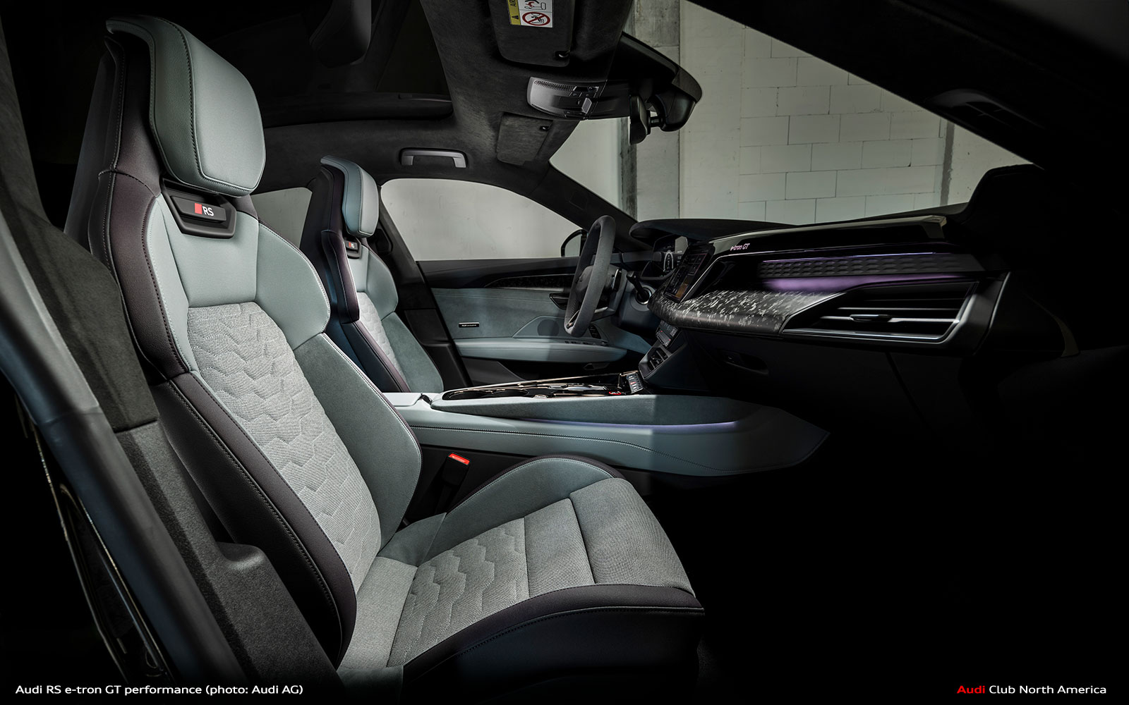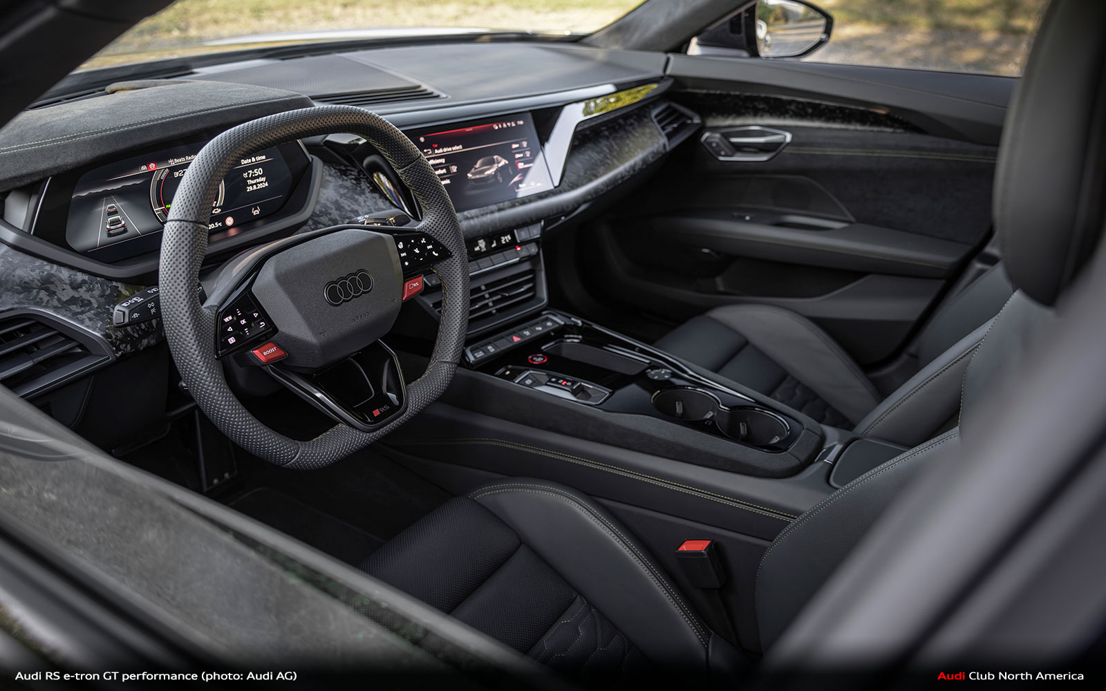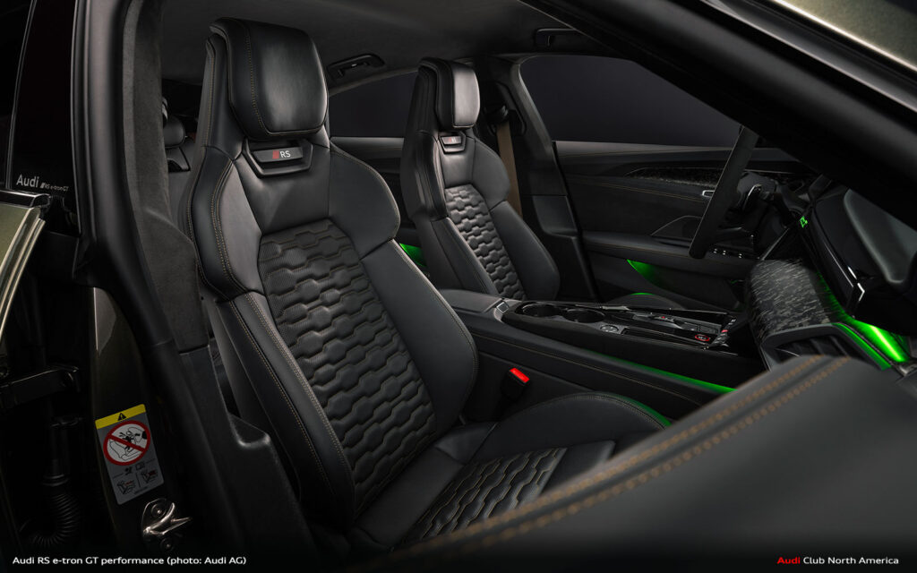As another interior highlight, the performance model features a new and exclusive design package with Serpentine Green stitching to match the Bedford Green exterior and 18-way adjustable seats. The decorative inlays are also available in matte carbon camouflage to match the exterior. A tribute to the 1994 Audi Avant RS 2, where the analog dials also came in white, the RS e-tron GT performance2 features a white Power Meter and speedometer as a special digital feature.