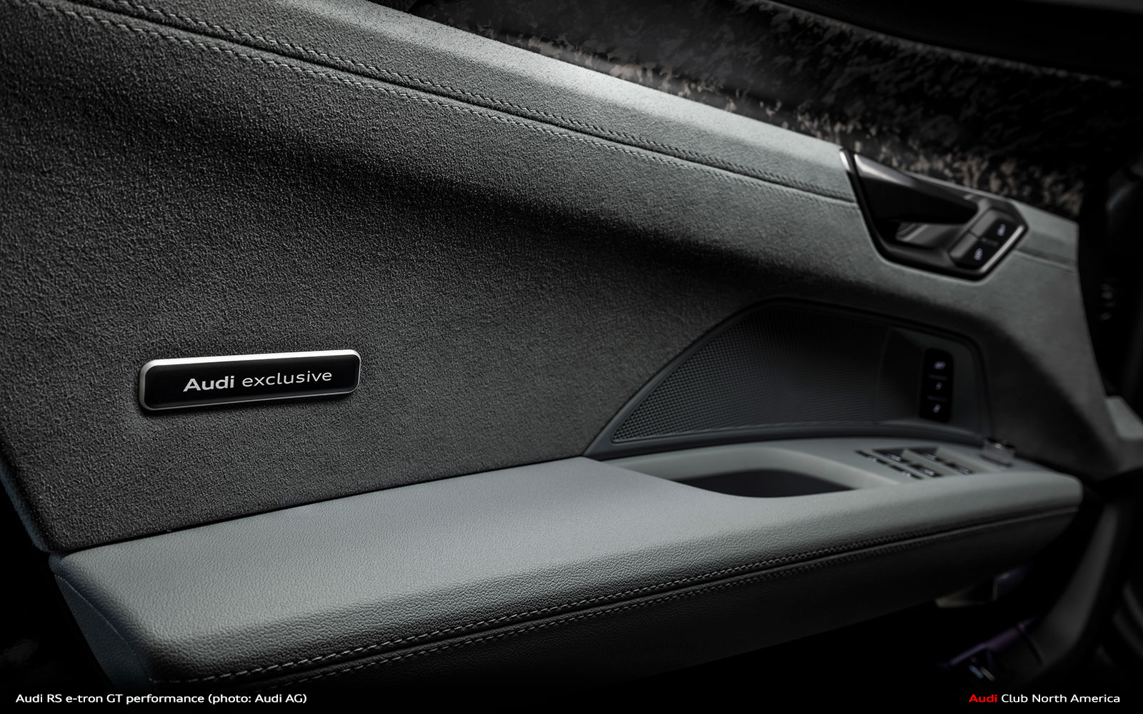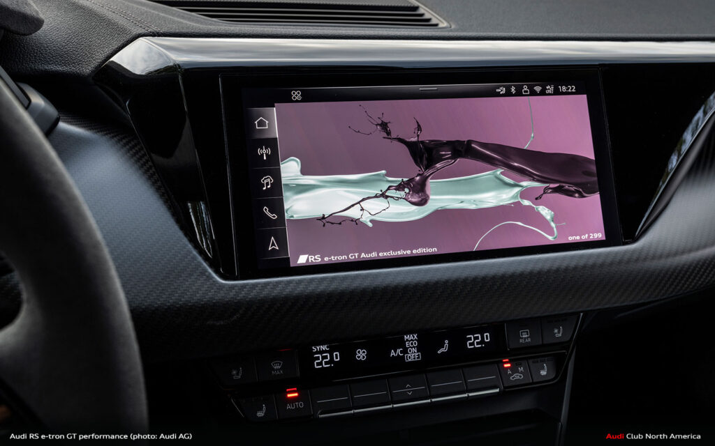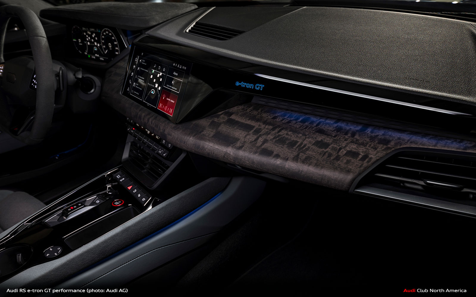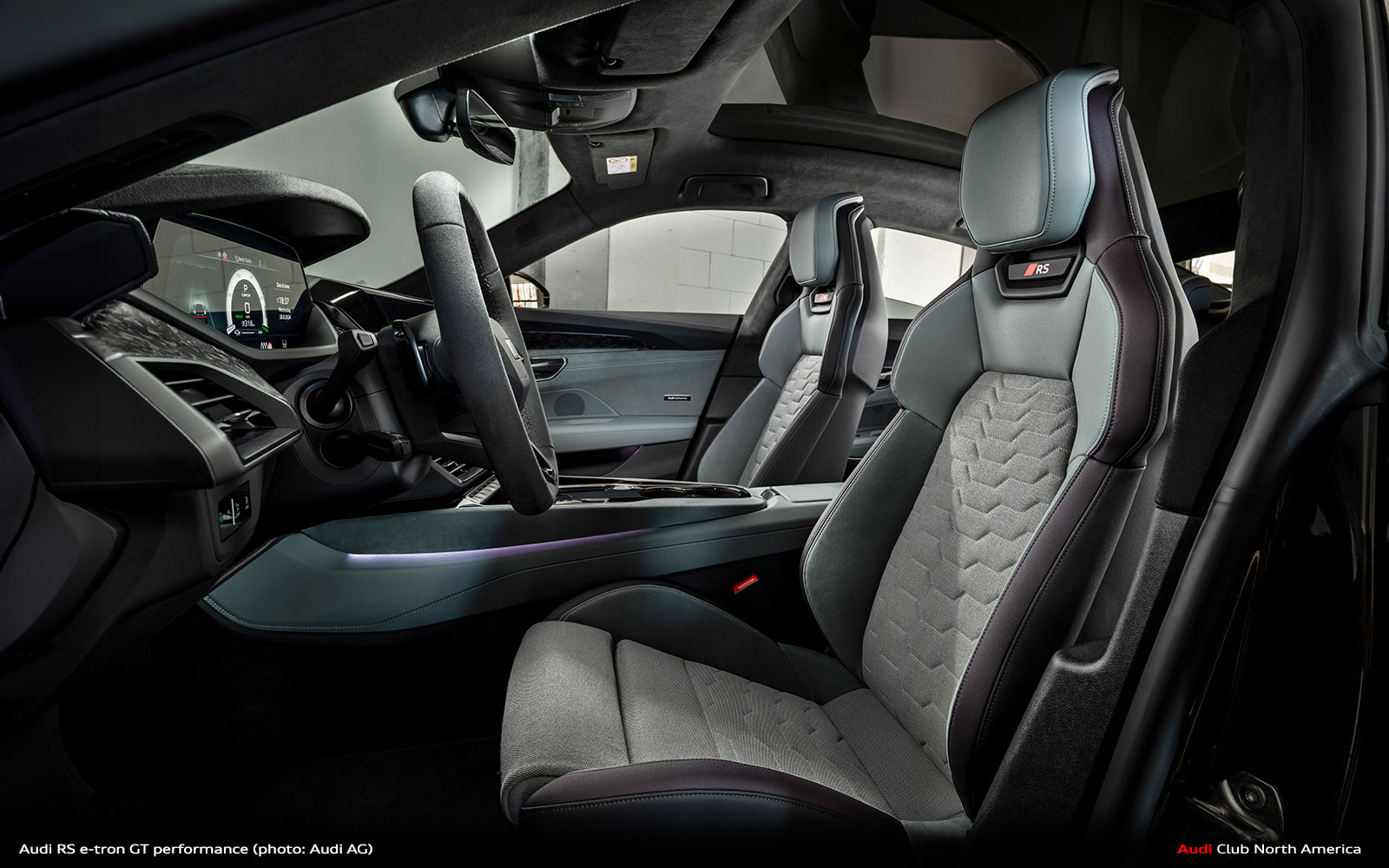 As another interior highlight, the performance model features a new and exclusive design package with Serpentine Green stitching to match the Bedford Green exterior and 18-way adjustable seats. The decorative inlays are also available in matte carbon camouflage to match the exterior. A tribute to the 1994 Audi Avant RS 2, where the analog dials also came in white, the RS e-tron GT performance2 features a white Power Meter and speedometer as a special digital feature.