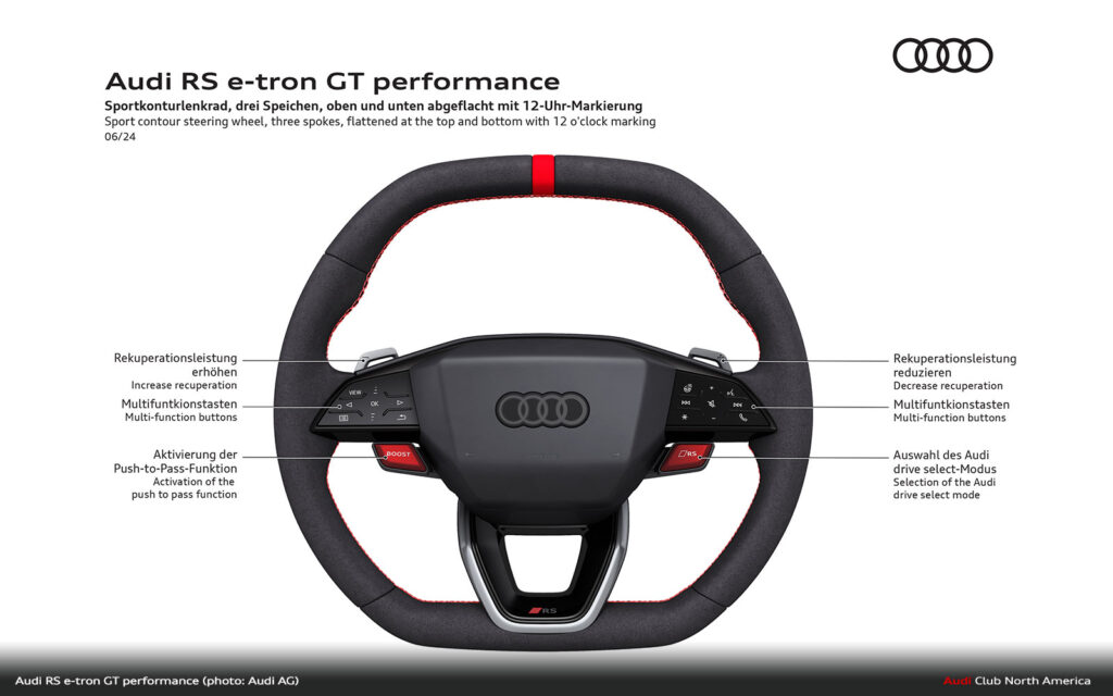 The Audi drive select dynamic handling system lets the driver control the vehicle’s character as usual. It features three profiles: efficiency, comfort, and dynamic. In addition, two individually configurable, RS-specific modes, RS1 and RS2, allow the driver to select drive, suspension, ride height, and sound. The driver can set these modes directly on the right-hand control satellite of the two red control satellites on the steering wheel, which is flattened at the top and bottom.