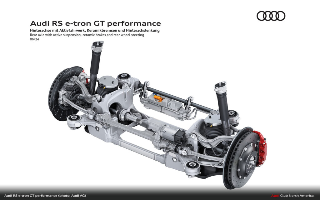 In addition to a permanent-magnet synchronous motor (PSM) on the front axle with a reinforced driveshaft and an output of 252 kW (342 PS), the electric Gran Turismo features a newly developed PSM on the rear axle with an output of 415 kW (564 PS).The increased copper density of the special hairpin winding in the electric motors’ stator maximizes current conduction. Moreover, the rotor in the electric motor at the rear is more compact and lighter. Overall, Audi has reduced the weight of the electric motor on the rear axle by ten kilos. What’s more, both electric motors have power reserves for dynamic driving situations. Launch Control can briefly use resources from the HV battery and the electric motors for an output of up to 680 kW / 925 PS (combined power consumption: 20.8–18.7 kWh / 100 km; combined CO2 emissions: 0 g/km; CO2 class: A).