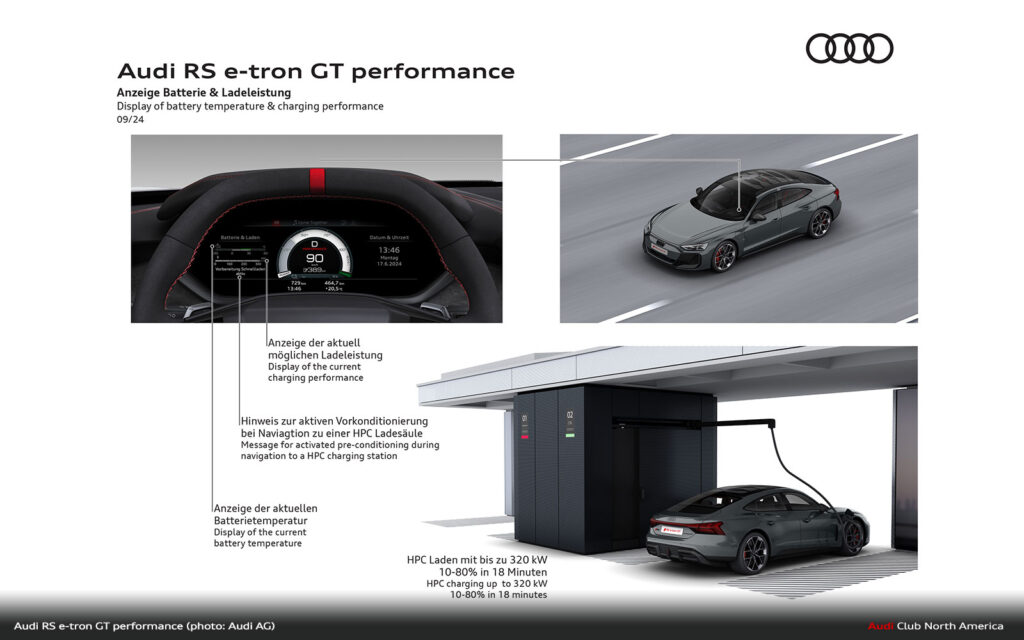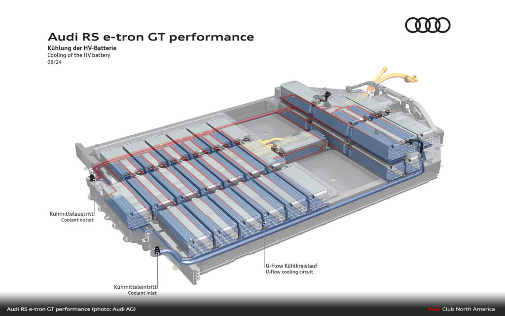 This is also the case when using the new push-to-pass function in the RS e-tron GT performance2, which provides a 70-kW increase in output at speeds above 30 km/h for up to ten seconds – as indicated by a timer in the virtual cockpit. When the driver activates push-to-pass, the battery uses the same map as for Launch Control. At the same time, the drive components automatically switch to the Audi drive select mode dynamic. After a minimum of ten seconds of regeneration, the function can be activated again. A new cooling plate with U-Flow architecture ensures homogeneous heat and cold transfer. The warmest cells in the HV battery always limit the charging current. At Audi, the guiding principle of “performance” also applies to the charging experience. The maximum charging power has been increased by 50 kW up to 320 kW. This allows the vehicle’s HV battery to charge from 10 to 80 percent in only 18 minutes at a high-power charging (HPC) station under ideal conditions.