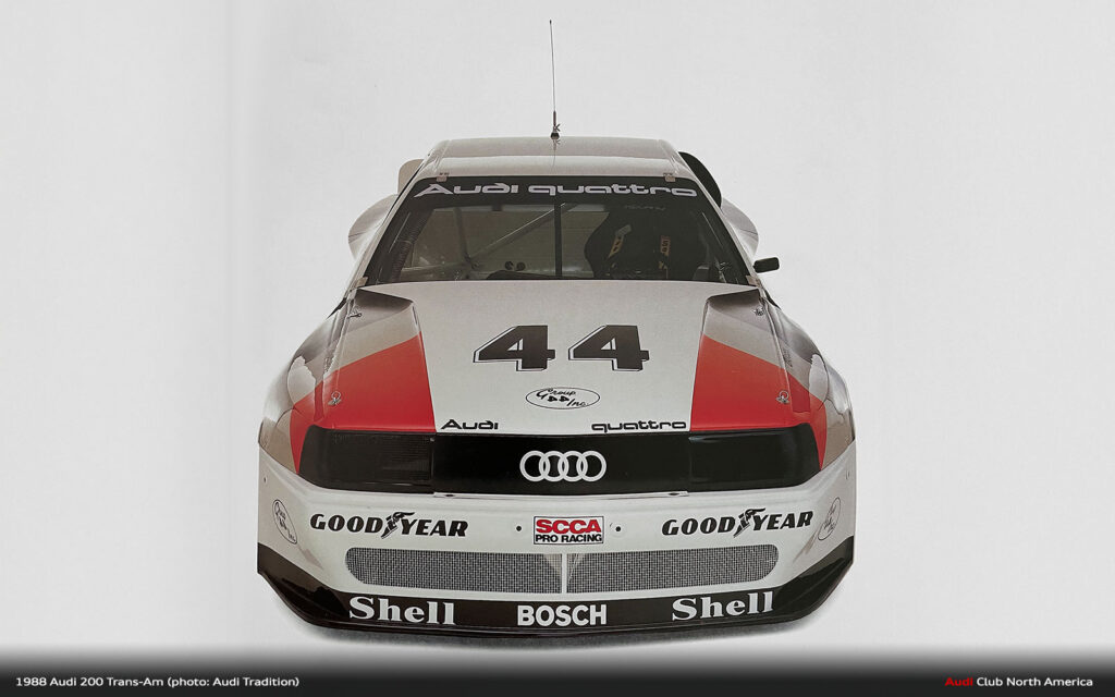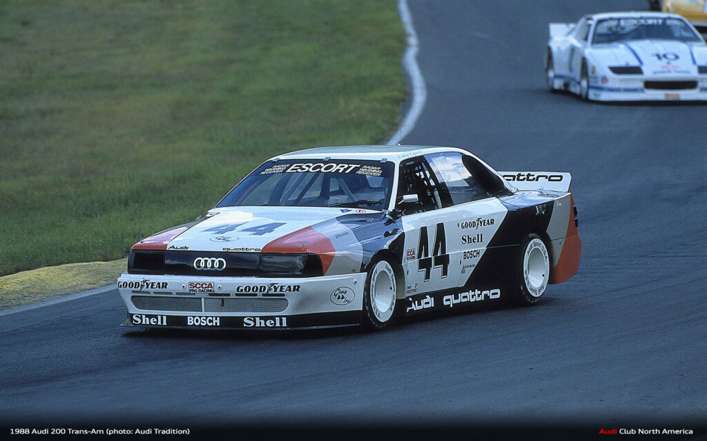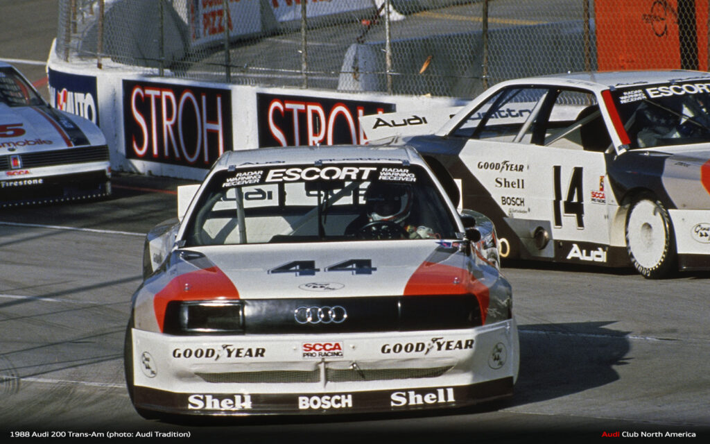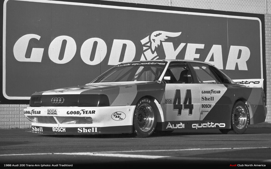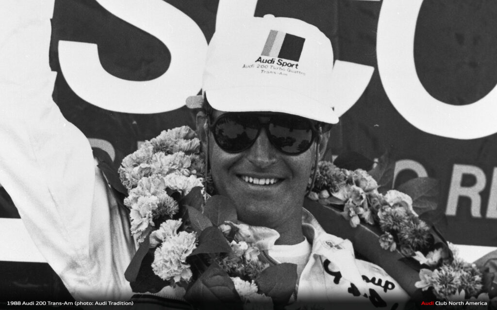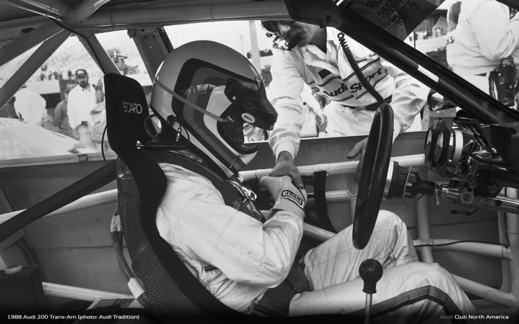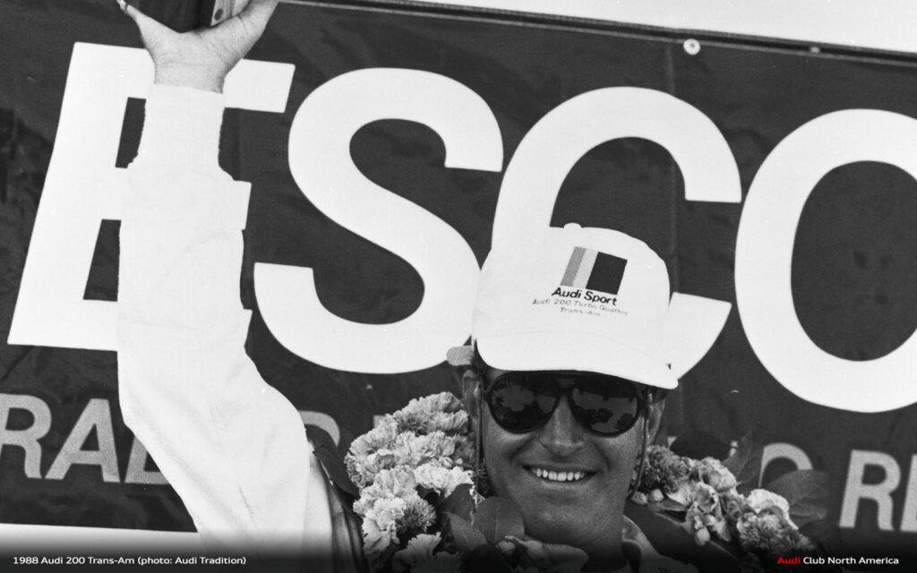 All the what ifs aside, that’s why we run the races. The fastest qualifier doesn’t always win. Things break and drivers make mistakes. Fortunately for Audi in 1988, excellent engineering meant things broke less and drivers Haywood, Stuck and Rohrl made fewer mistakes. Group 44 maximized the Audi 200’s quattro drive advantage to secure the Manufacturer’s championship and Haywood’s consistently fast, smart driving style earned him the Driver’s title. Bill Oursler’s T-A season recap in National Speed Sport News stated, 1988 “will always be remembered as the year four-wheel-drive came of age in pavement road racing….” We couldn’t agree more.