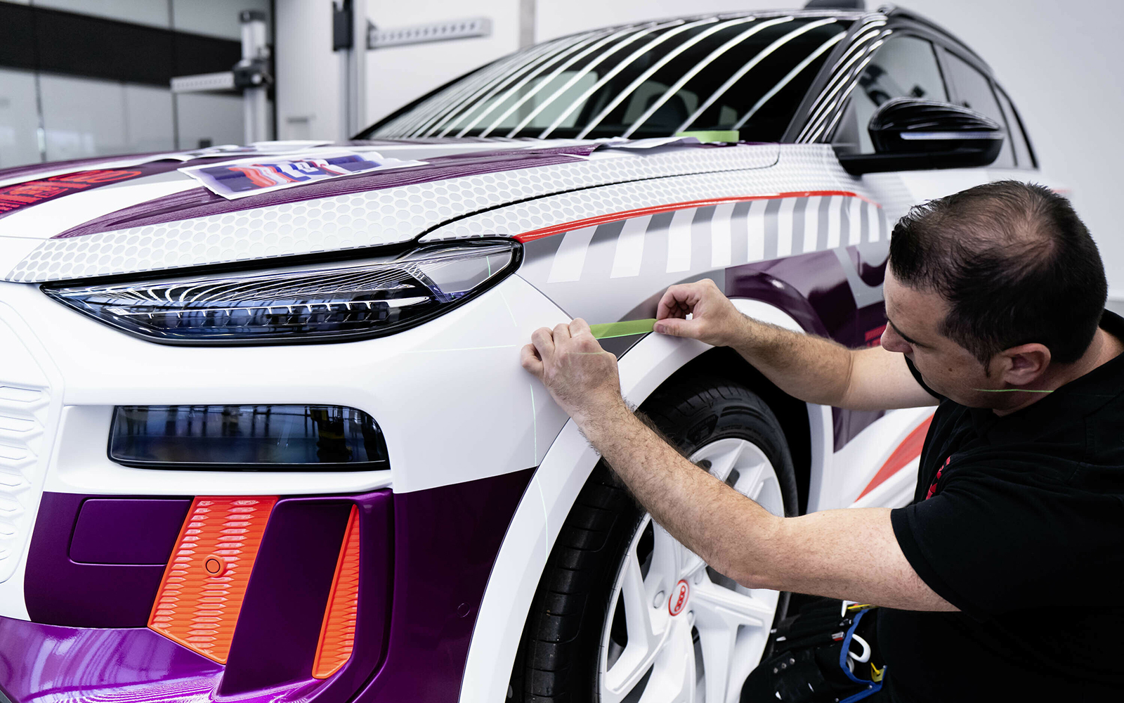 “Audi’s design language is taking the next step with the Q6 e-tron, and we wanted to make that clear in the decals,” says dos Santos. “A vehicle’s architecture and character are always unique and so is each individual decal design. It always starts with deciding which elements on the vehicle you want to highlight and emphasize.” While the new project also draws on previous design elements – such as the neon red color also used on the Audi Q6 e-tron, widely familiar from the memorable decals on the 2018 Audi e-tron – each new model also opens a new chapter. dos Santos remarks. “At Audi, technology and design are inextricably linked and form a single entity. As our technologies become more powerful and precise, this is also visible in our design, choice of materials, and storytelling,” dos Santos explains.