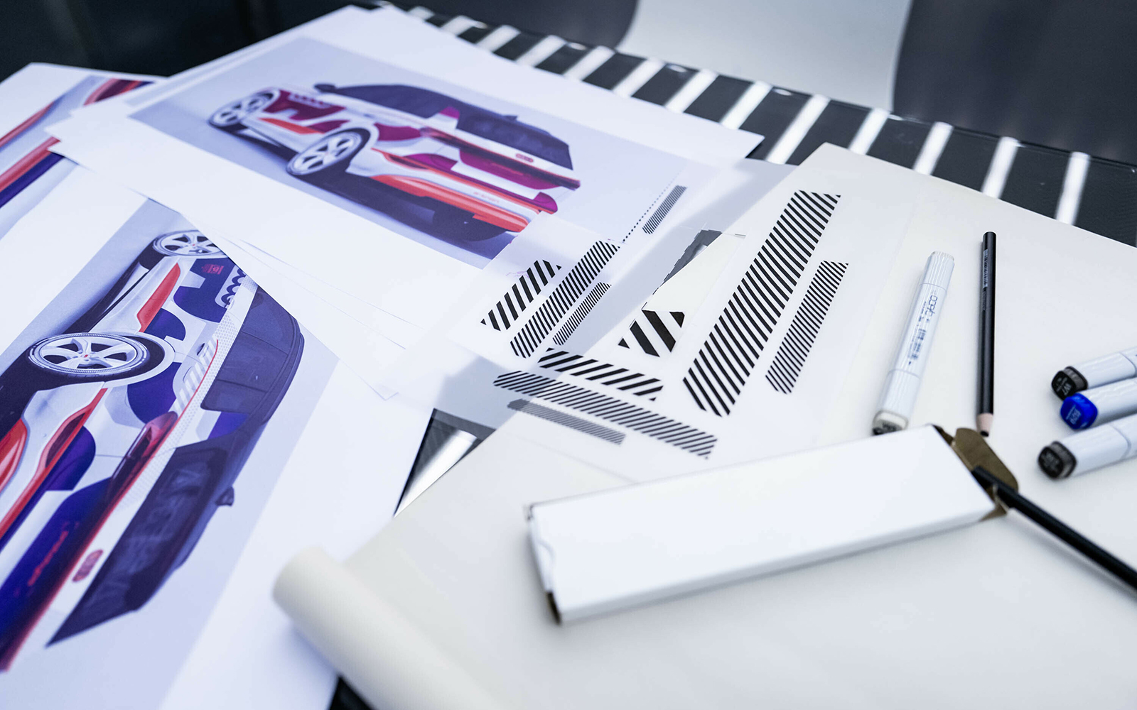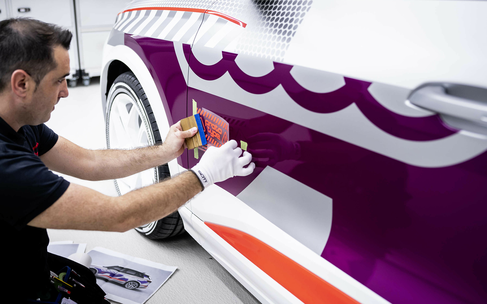 The decal design process is similar for each vehicle. Using detailed renderings from exterior designers, the team works together to decide which elements make up the model and which parts of the body to focus on. The aim is to abstractly reflect and visually reinforce the character of the model through decals. “The original idea always has to remain the guiding principle.”