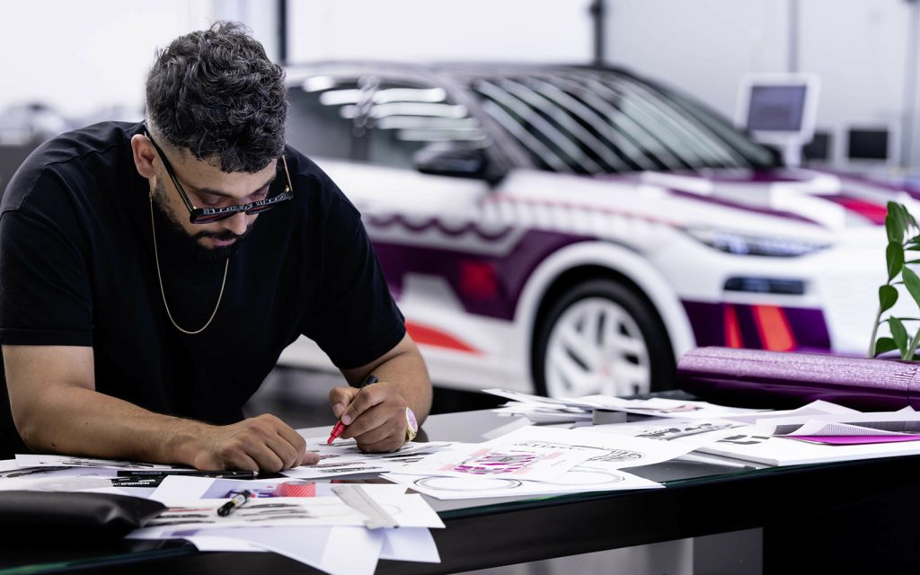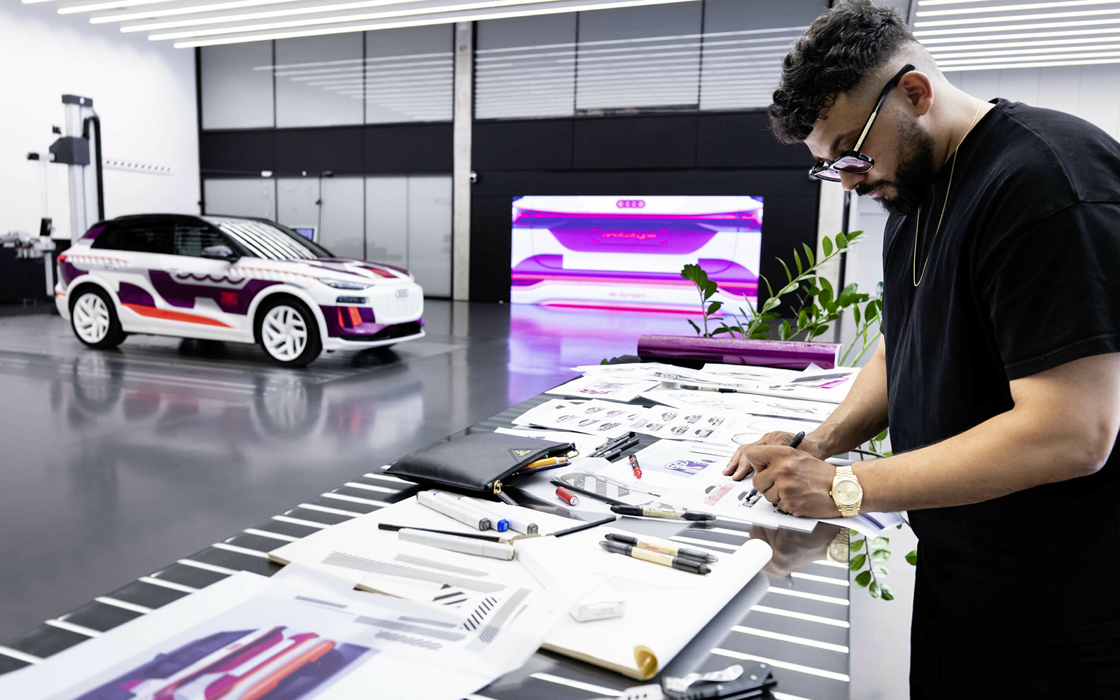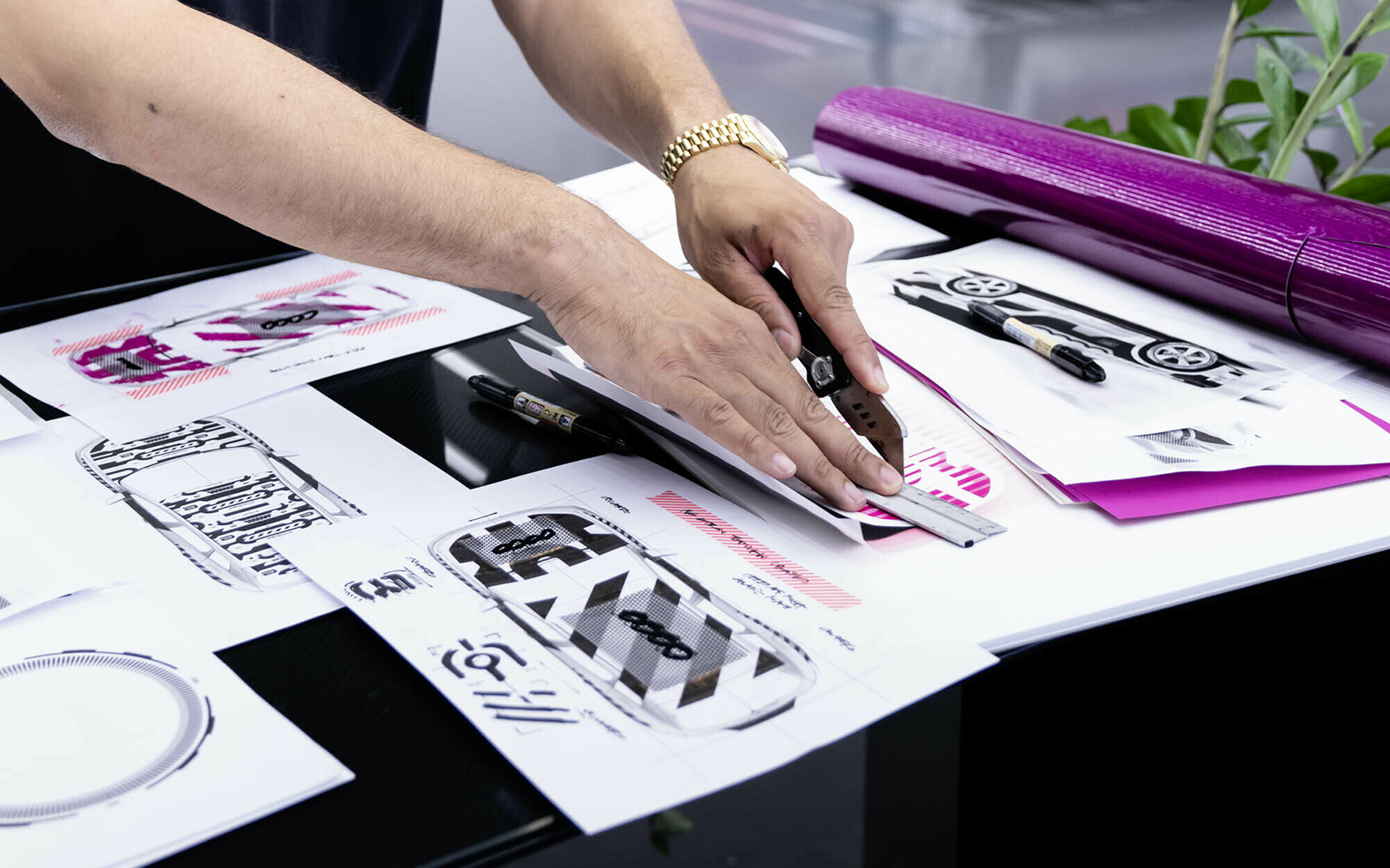 That is when dos Santos’ design process really begins. With lots of hand-drawn sketches on paper (“I just need that connection between head, pencil, and hand”), the vision is finally translated into the vehicle using image and graphics software. The car is completely covered in decals, a process that takes several days due to the high level of meticulousness and precision required. “This is the moment of truth,” dos Santos elaborates, because “lines that looked straight before no longer appear straight at all on the body due to its many corners and edges.” During this phase of the work, dos Santos says, “a lot is thrown away, rethought, and redesigned.” In the process, dos Santos always has to consider how people will later view his design. “You never know which angle a person will see the Audi Q6 e-tron from for the first time. It’s not like in a movie with a camera, where you get to decide to focus first on this part, then that part. The vehicle is a sculpture. The decals have to work from 360 degrees, around the whole car, all the time.”