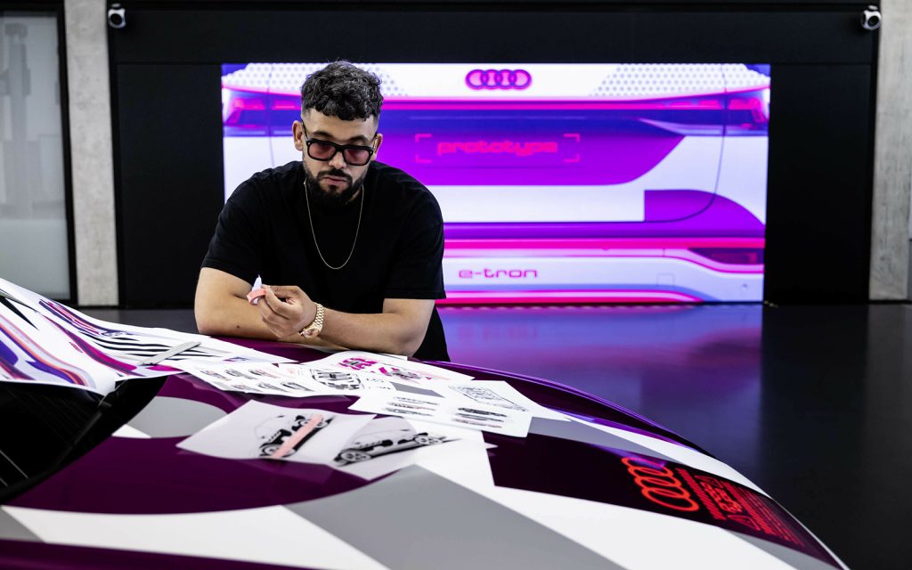 Each design is one of a kind: Since unveiling the Audi e-tron in 2018, the brand with the four rings has been fitting prototypes and one-off models with individual decals, Audi’s so-called “livery design” – most recently the S1 Hoonitron and the Formula 1 show car. The brand with the four rings has already presented more than 20 vehicles featuring this special exterior, all designed by Marco dos Santos, who is responsible for Design Branding at Audi. His latest vision now decorates the Audi Q6 e-tron prototype. Marco dos Santos uses his latest decals to explain the philosophy behind the expressive design, how men’s suits factor in, and what makes even a designer nervous.