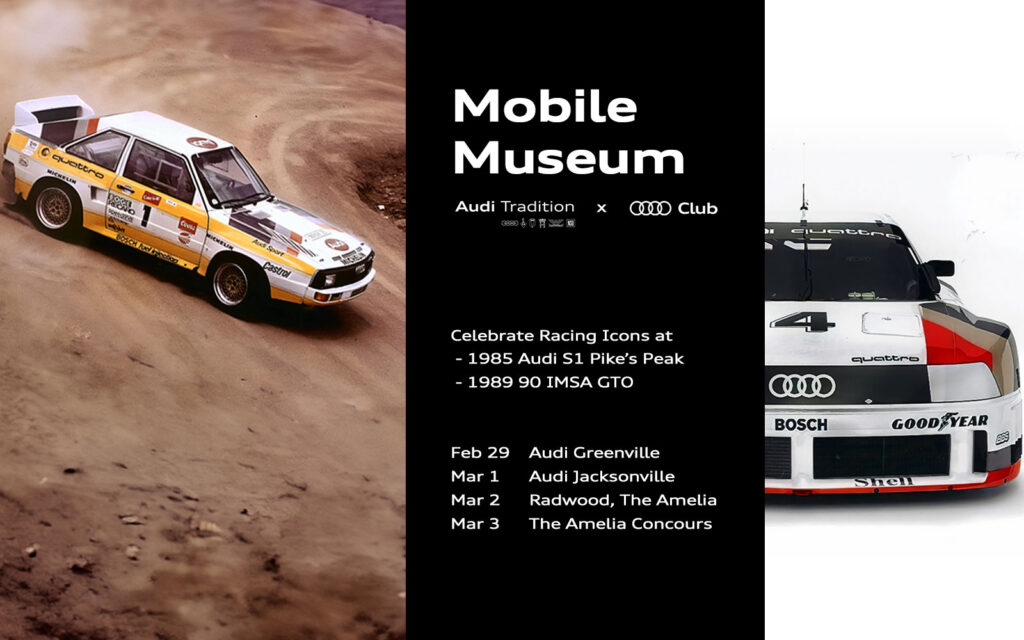 In case you didn’t know, Audi Tradition has two of its most revered cars in the United States right now. Michèle Mouton’s 1985 Pike’s Peak winning Audi Sport quattro S1 and the legendary 1989 Audi 90 IMSA GTO have been doing the rounds, just last week at the F.A.T. Ice Race, and now headed to The Amelia Concours week in Florida. Along the way, they’ll be making a few stops at Audi Greenville (South Carolina) and Audi Jacksonville (Florida). We’re calling it the Mobile Museum.