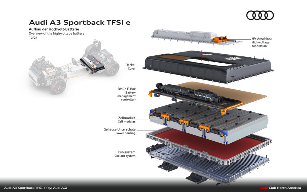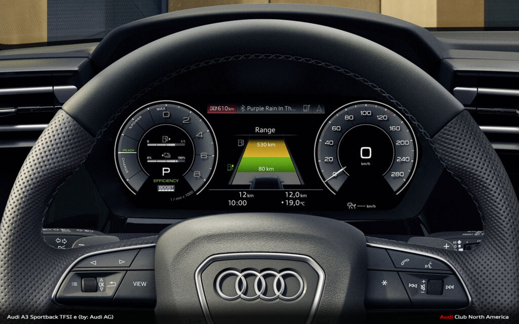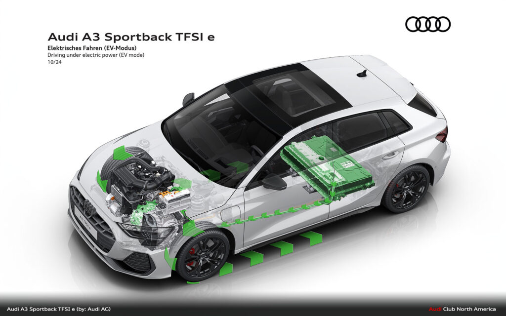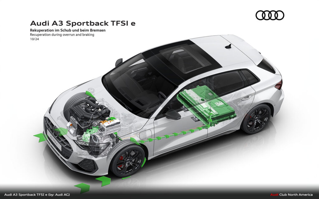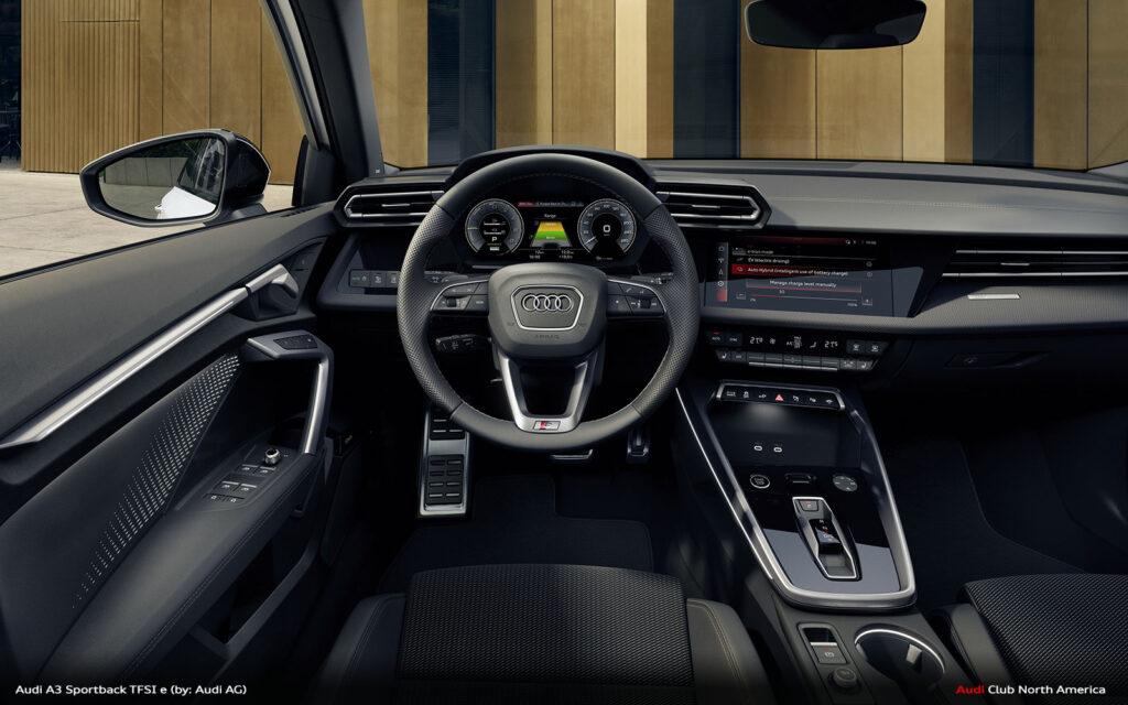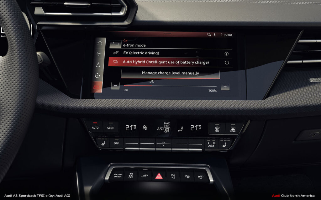 The compact plug-in hybrid‘s drive management is designed for high efficiency. Starting is always electric, down to -28° C. The driver can prioritize the electric drive with the EV button in the switch panel or by selecting it in the MMI, which enables the vehicle to operate like a fully electric model. In “Auto Hybrid” mode, the primary operating mode, the combustion engine and electric motor share the work intelligently – purely electric driving at low speeds, with the TFSI engine taking priority at higher speeds and often both drives together. Depending on the situation, the A3 Sportback TFSI e can coast, recuperate – both in thrust and braking – or boost together with the electric motor and TFSI. In addition, the hybrid management system keeps the battery charge level constant to save enough electrical energy for later use, for example, in a low-emission zone.