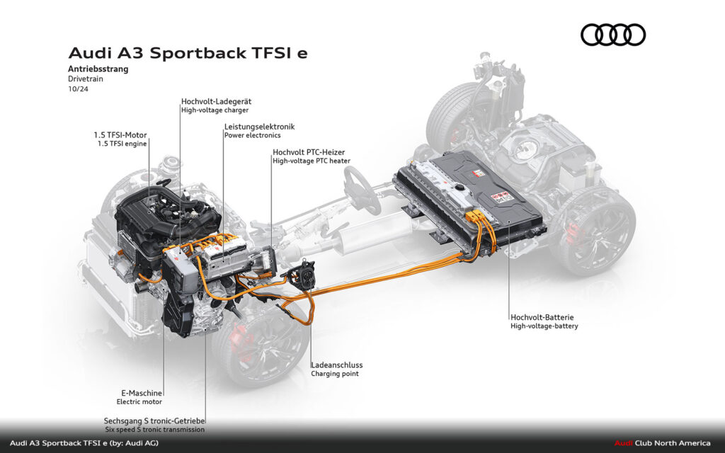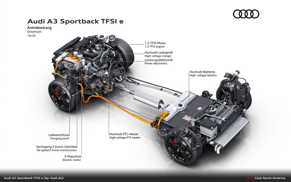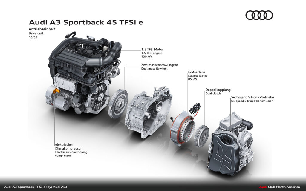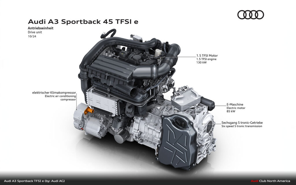 The electric drive is provided by a permanently excited synchronous motor, which now delivers 85 kW and 330 Nm of torque. As with its predecessor, it is integrated into the housing of the six-speed S tronic, which is now equipped with a more robust gearbox bearing to cope with the higher system output.