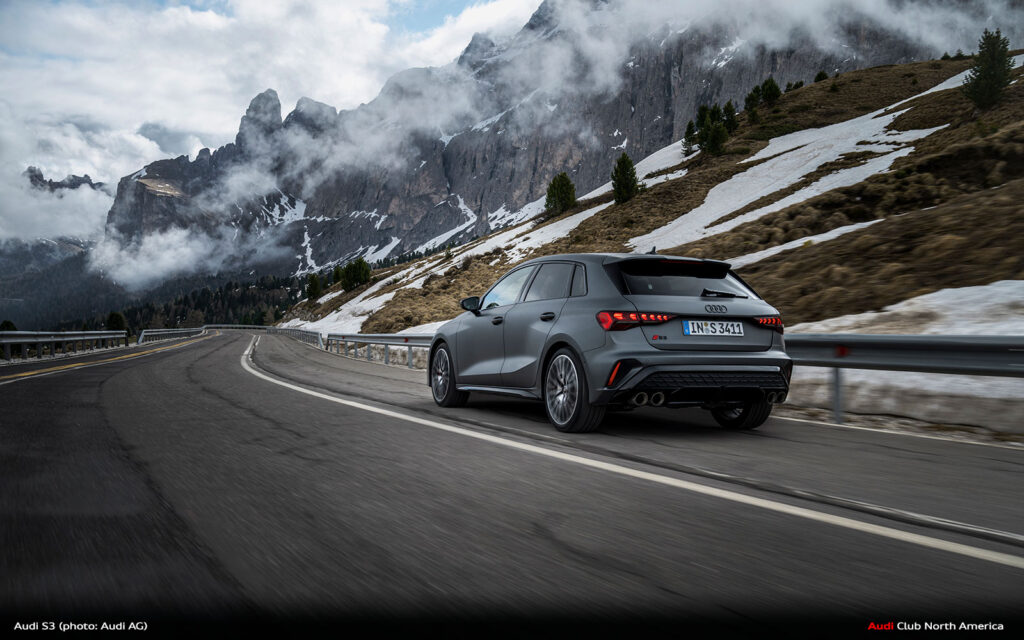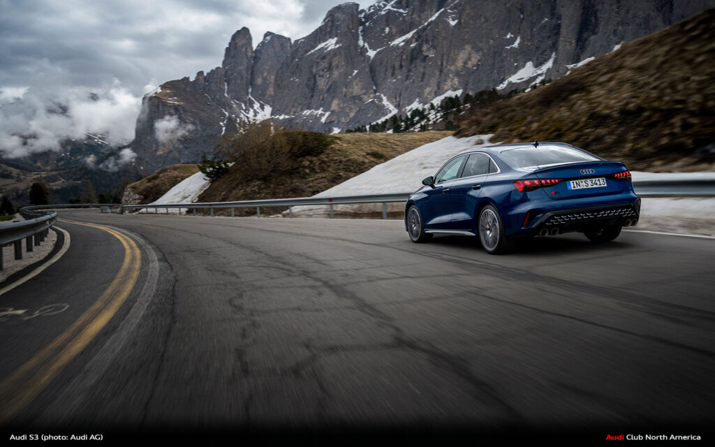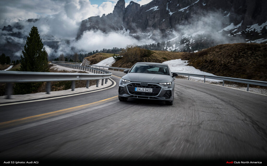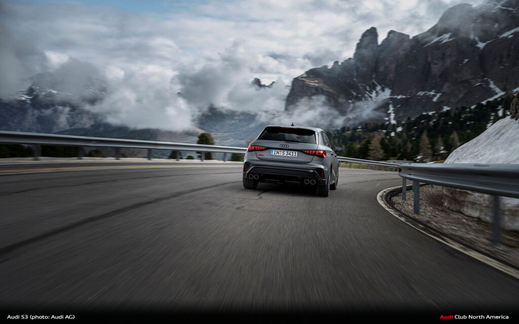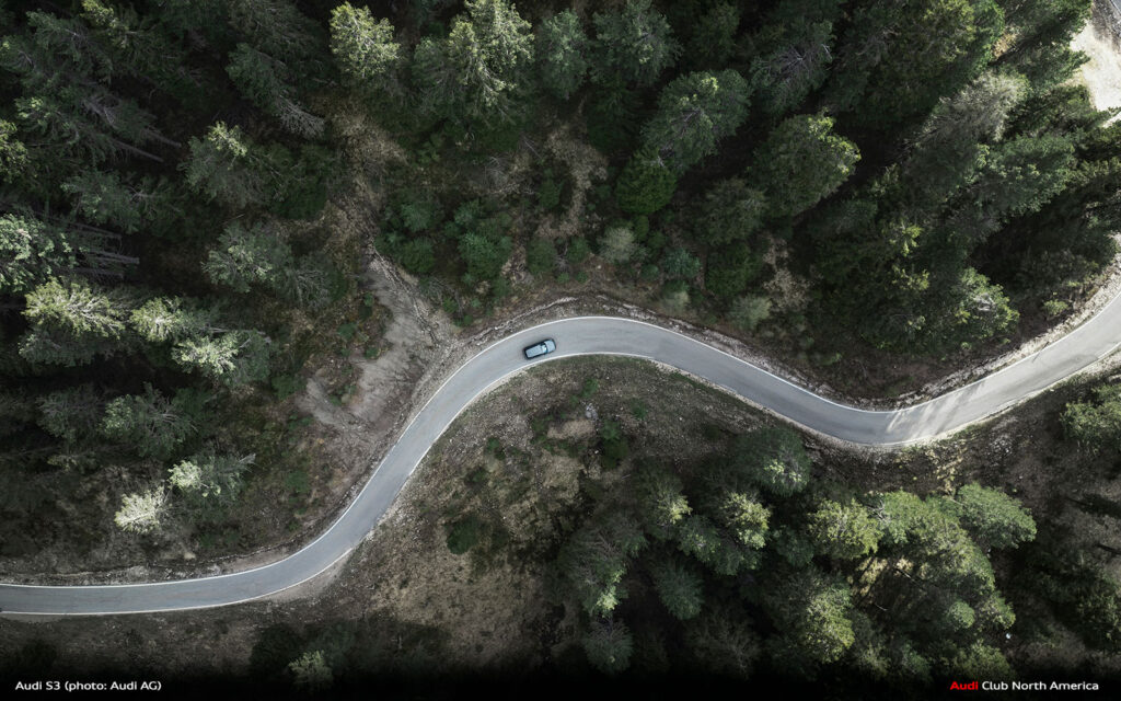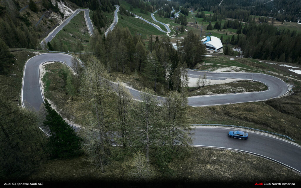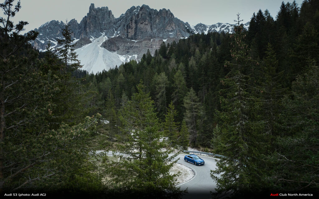New Audi S3 on Winding Mountain Passes in the Dolomites