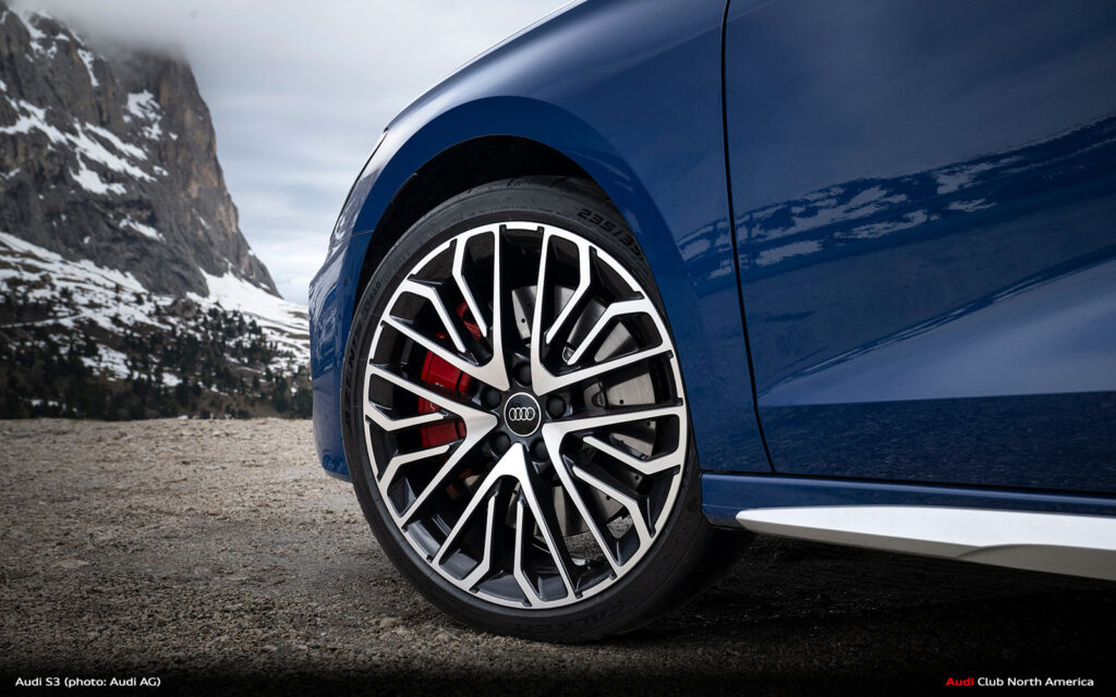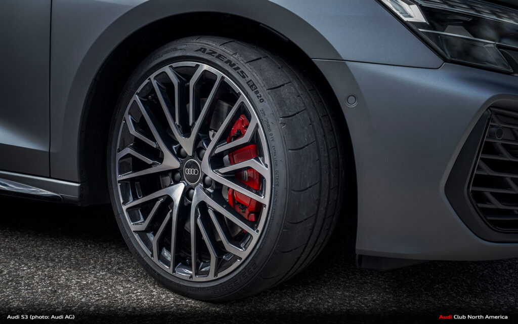 The outstanding handling characteristics are optimally transferred to the road by a 235/35 R19 sports tyre. Specifically tuned for the S312, the Falken Azenis offers remarkably high grip and precise track stability, especially on dry roads. The exceptionally strong shoulder section of the tire with an increased contact patch also contributes to this. It is important during dynamic driving and can transfer more lateral load. The Audi S312 shows its heightened agility and performance on winding mountain passes in the Dolomites.
