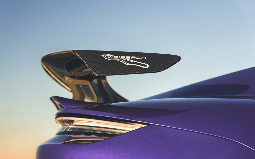 Additional aerodynamics measures include air deflector elements on the underbody and a new front diffuser. In the rear, the model with the Weissach package features a fixed rear wing in a carbon-weave finish with wing supports fixed to the body. The total downforce here is up to 220 kg. The Weissach package logo features on both sides of the rear wing. Exclusively available on request is a striped wrap in Volt Blue, Black or Black (matt). This further accentuates the car’s motorsport character. The striped design can be combined with the black decal set.