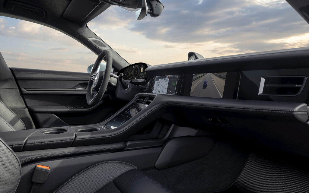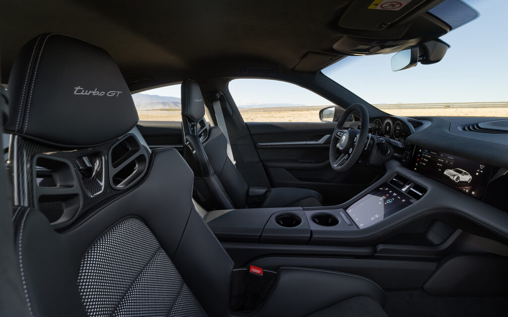 On the GT sports steering wheel, the rim is covered with black Race-Tex and has a 12 o’clock marking. The Taycan Turbo GT features the Sport Chrono package from the Taycan Turbo S.