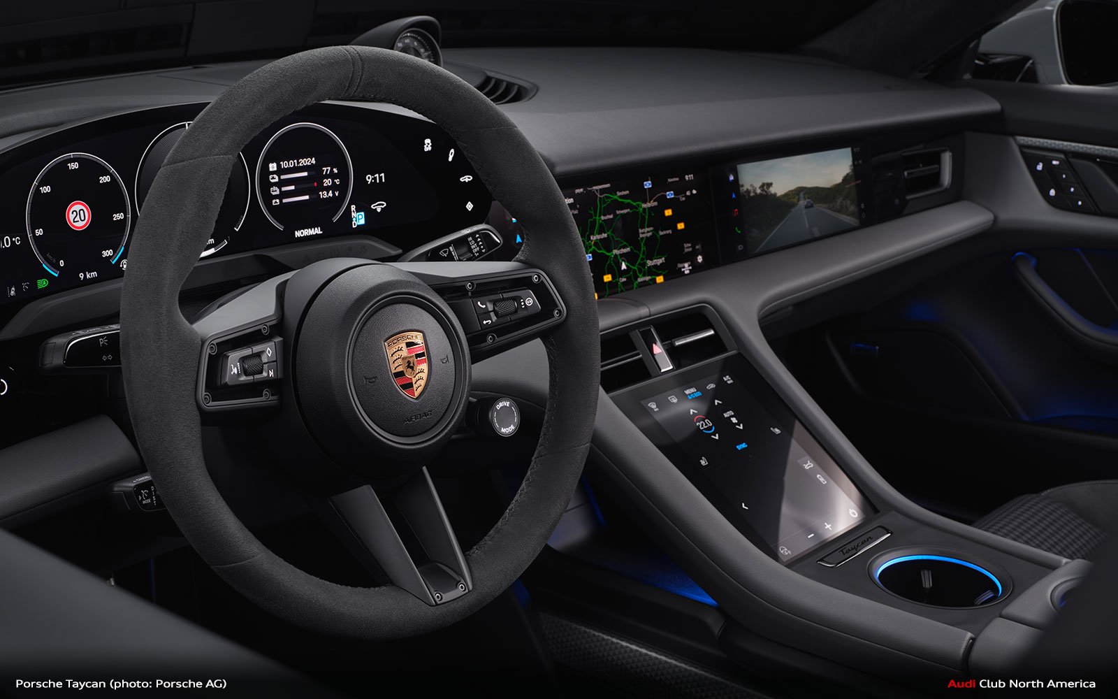 In the new 2025 Taycan models, the list of standard equipment is even more extensive than before. Lane Change Assist, heated steering wheel, Ambient lighting, electrically folding exterior mirrors with mirror surround lighting, Porsche Intelligent Range Manager (PIRM), a new cooling system, smartphone tray for wireless charging, electric charging ports on the driver and front passenger side and Drive Mode switch are all now standard features.