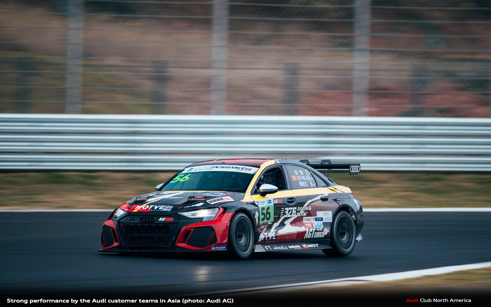 Title success at the finale: 326 Racing team ended the season in the China Endurance Championship with a class win. The driver trio of Zhao Di/Zhu Shengdong/Lai Jingwen finished second in their class in the Audi RS 3 LMS after two and a half hours of racing. The three Chinese amateur racing drivers thus won the TCE title in this endurance racing series.