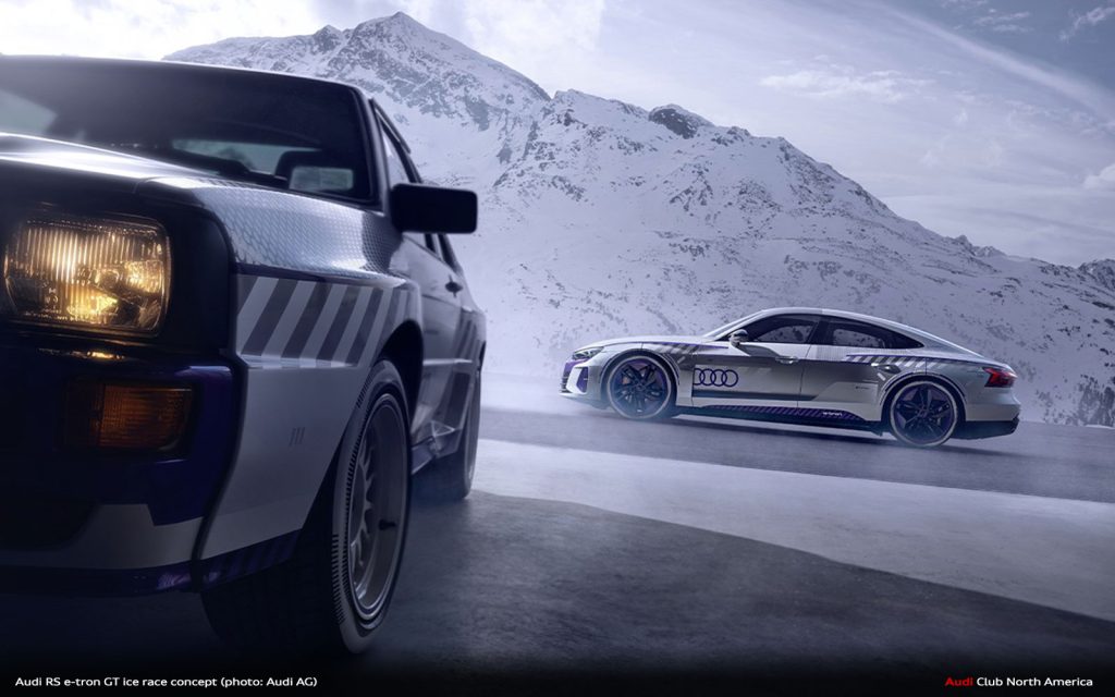 Audi has revealed images of what they’re calling the RS e-tron GT ice race concept. Said to be “influenced by the legendary GP Ice Race…