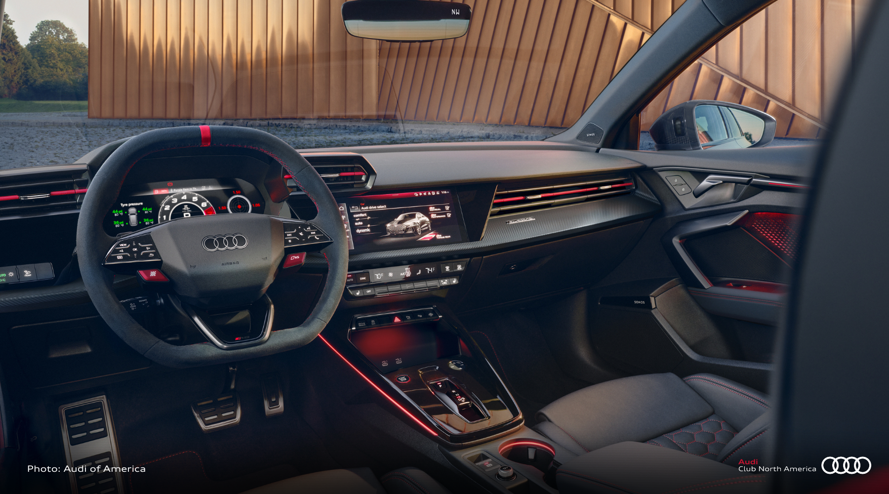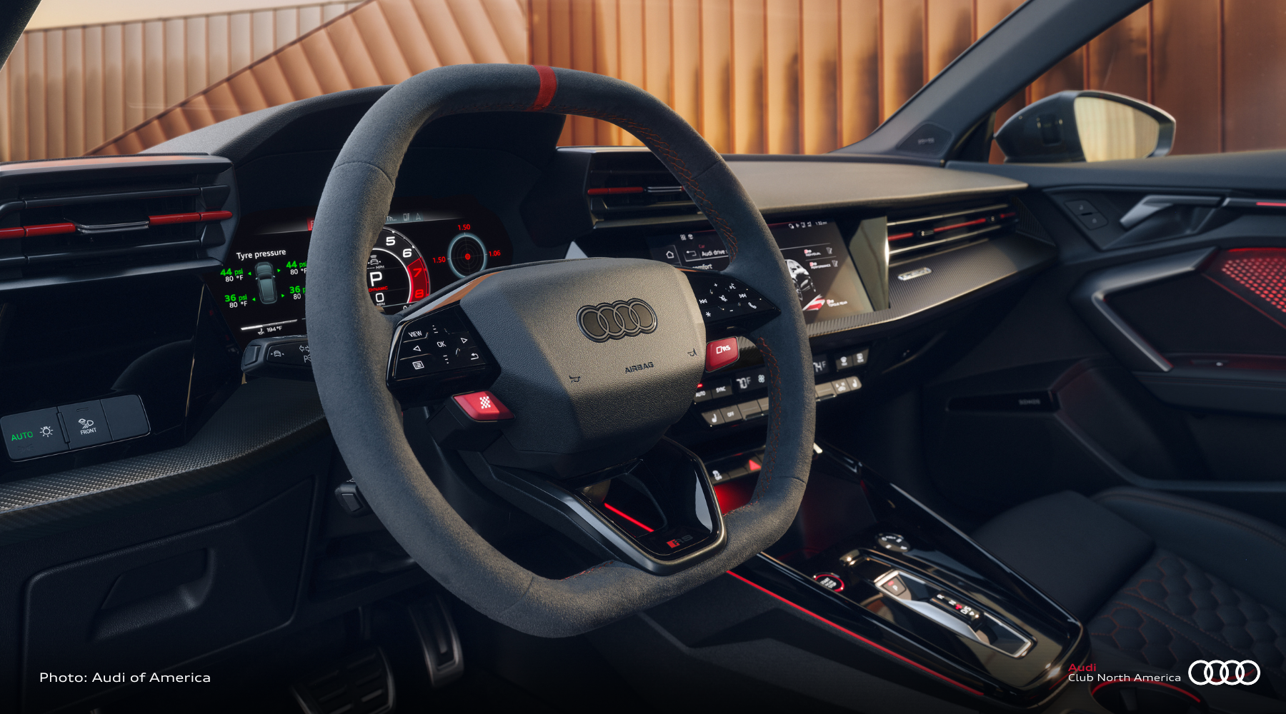 The interior experience is enhanced to strike an intentional balance between performance and luxury, without losing sight of the sporty and agile character of the RS 3. An all-new RS steering wheel includes distinct RS Mode satellite buttons and aluminum paddle shifters, providing a responsive and conveniently thrilling driving experience. This new flat top and bottom steering wheel design comes standard wrapped in perforated leather, with an optional Alcantara finish for the benefit of additional grip.