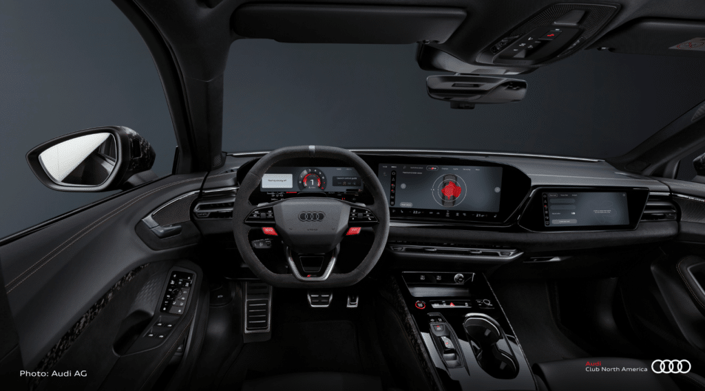 Inside, the cockpit centers around a curved OLED MMI display and RS-specific digital instrumentation. Performance data, lap timing, tire temperatures, energy flow visualization, and launch guidance are all available in real time.