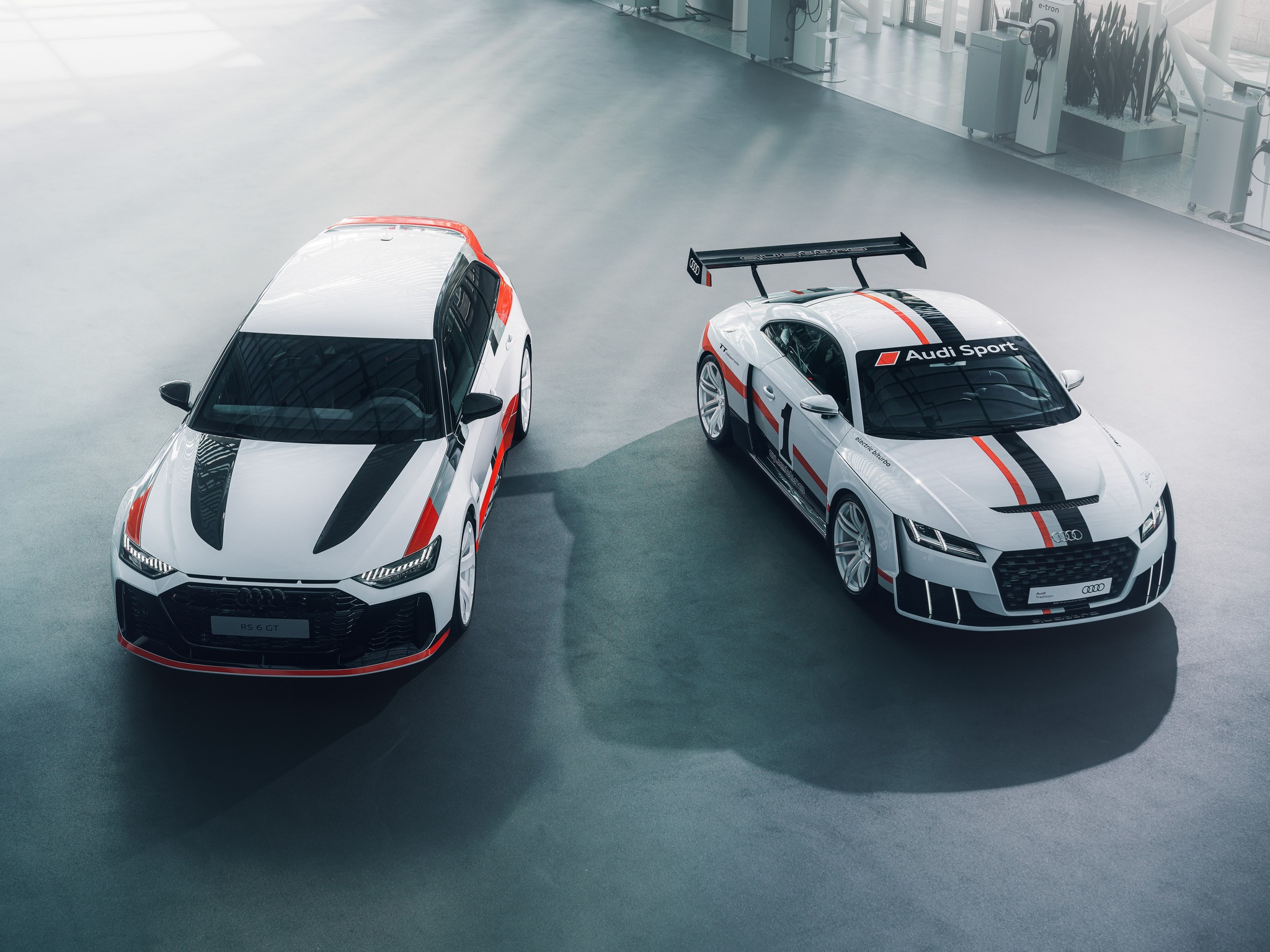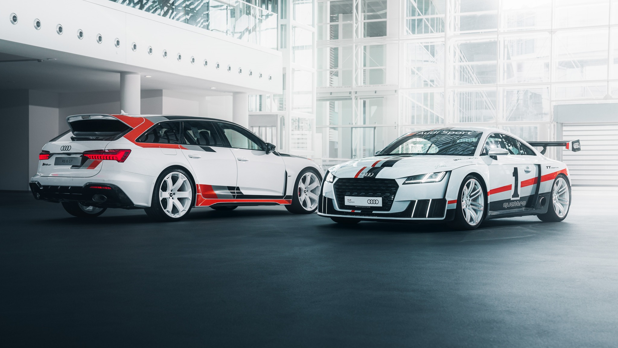 “Dream pair – the Audi RS 6 Avant GT meets the Audi TT clubsport turbo. Both models were inspired by the successful Audi 90 IMSA GTO of the late 1980s – recognizable by the spectacular design and iconic foiling. The Audi TT clubsport turbo technical study was introduced at the Wörtherseetour 2015, eight years later the Audi RS 6 Avant GT came to the market as the spearhead of its line.”