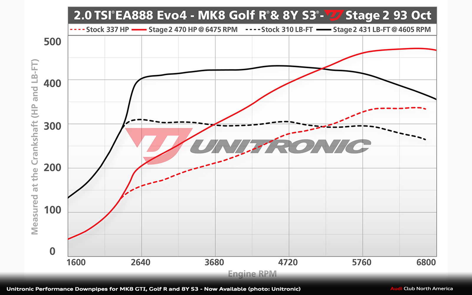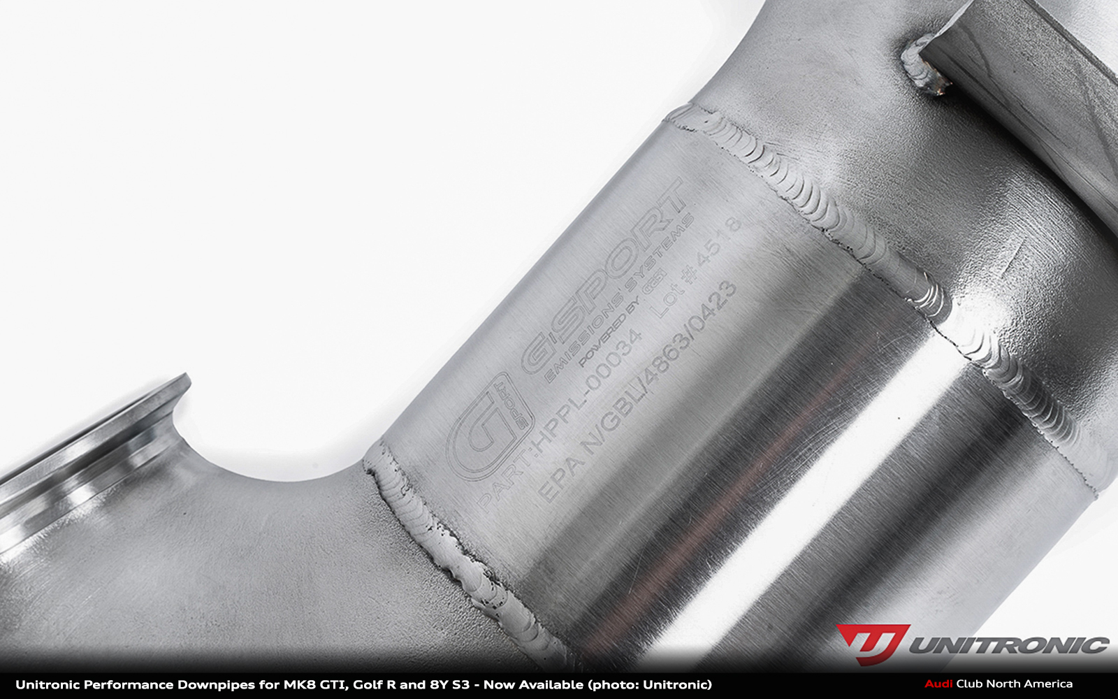 Unitronic® is proud to release its Performance Downpipes for the MK8 GTI, Golf R and 8Y S3 equipped with the 2.0TSI EA888 EVO4 engines. These Performance Downpipes are a direct bolt-on upgrade, designed to optimally eliminate unwanted restrictions in the factory downpipes, reduce turbo lag and enhance the exhaust note, while utilizing GESi 5” 400cpsi ultra high output catalytic converters. GESi’s GEN2 ultra high output (UHOX) catalytic converters were designed in conjunction with Unitronic for several 2017+ Audi and Volkswagen® applications and are rated at up to 1000HP by GESi. Paired with Unitronic Stage 2 Performance Software and other supporting bolt-ons, these Performance Downpipes help yield up to 470HP / 431LB-FT with more to come.