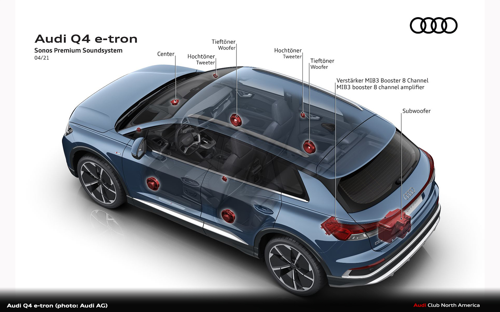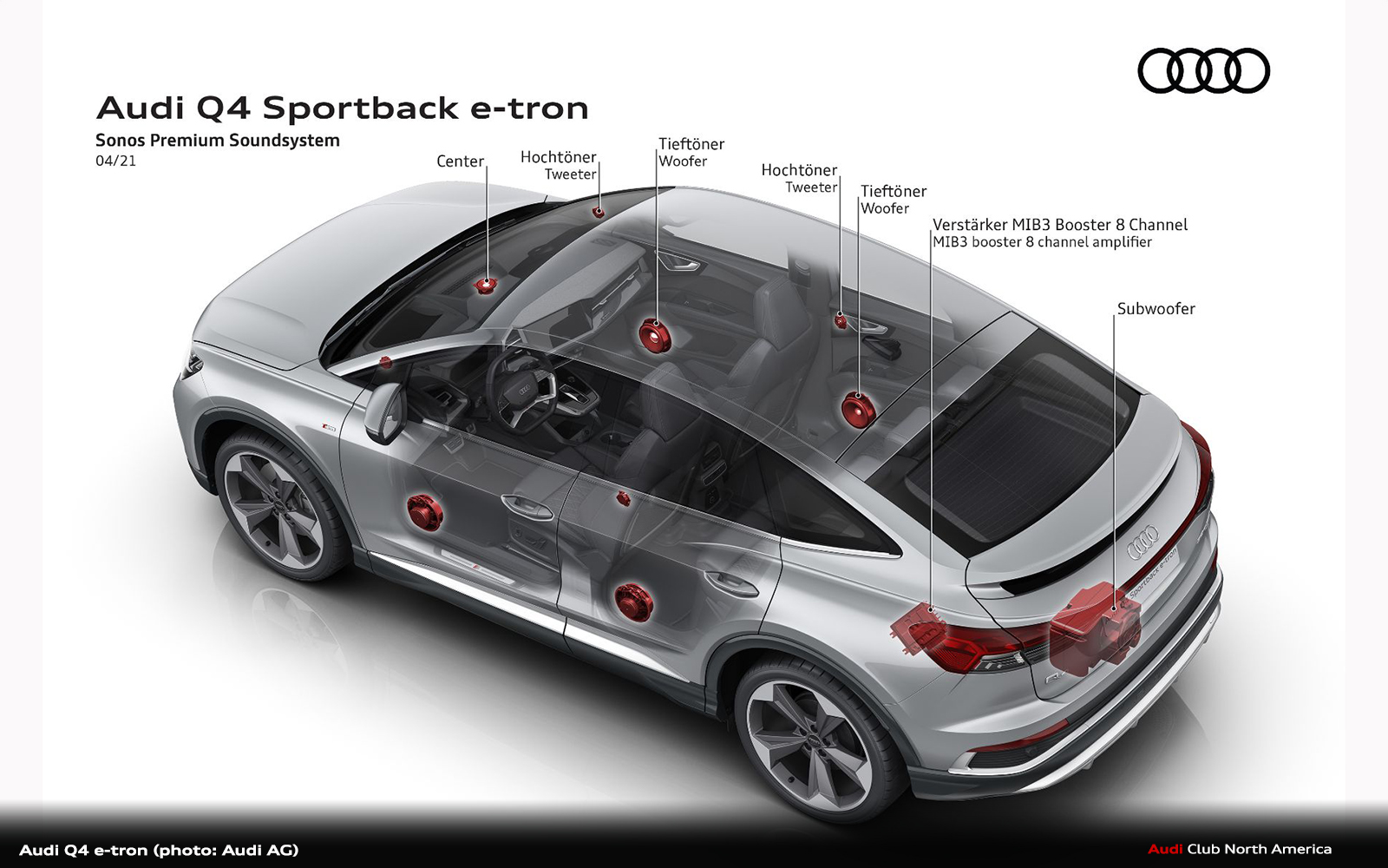The “character sound” is defined by the exterior sound, not only by the infotainment system or the interior speakers. If necessary, the system can be deactivated at any time in the Audi drive select menu. The Acoustic Vehicle Alerting System or AVAS, which is a legally required warning sound, is part of the “character sound” and is active at all times. This does not affect the way the infotainment system sounds.