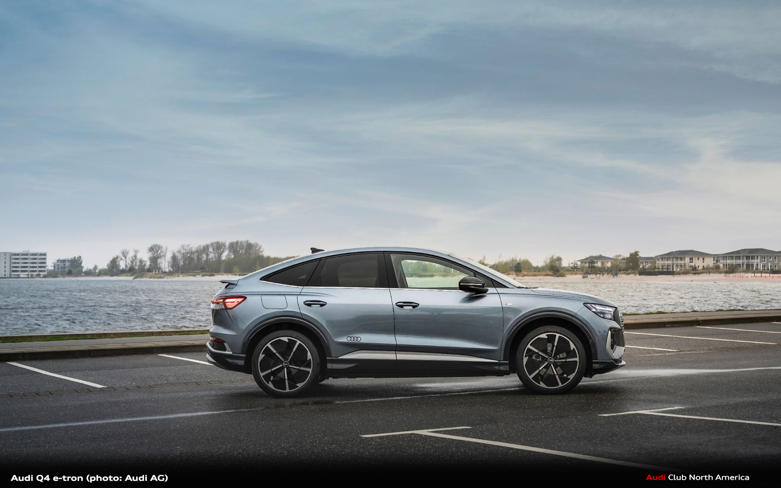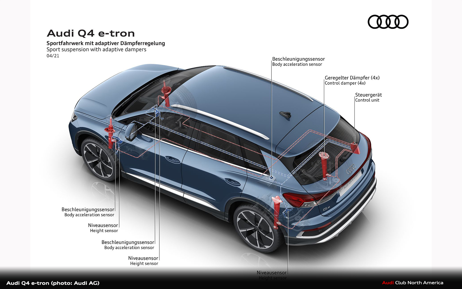 With the sport suspension, the body is 15 millimeters lower. The new spring/shock absorber tuning and the new steering tuning provide a balanced, solid driving experience and a sporty steering response typical of an Audi. The Audi Q4 e-tron models respond more directly to steering changes for greater sportiness and agility.